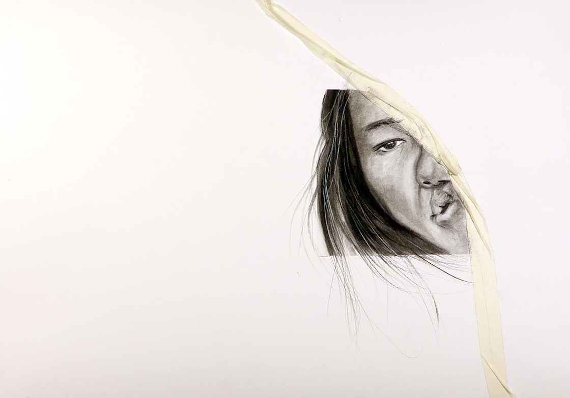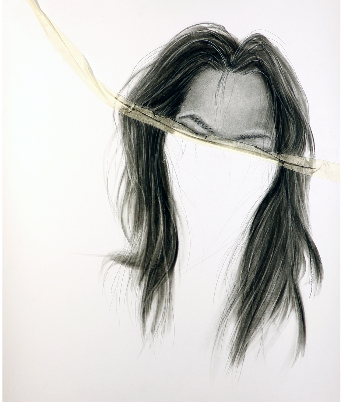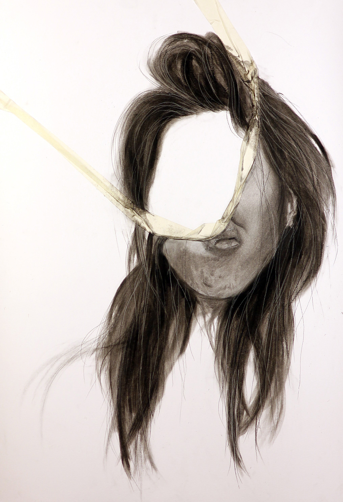 The work consists of a series of mixed media charcoal drawings depicting contorted and manipulated figures. Parts of the drawing (the masking tape) interact with thesurrounding space for example, some parts of the work flow down to the ground.